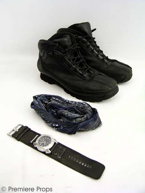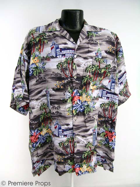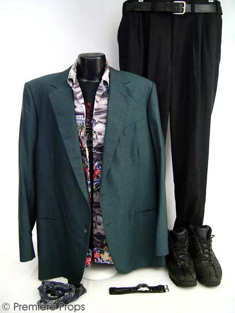 Worn throughout the film, this costume includes a green two button blazer, short sleeve button up Hawaiian shirt, black "Wicked Quick" short sleeved t-shirt, charcoal gray pleated pants, a black leather belt, a black "Kahuna" watch, a blue bandanna and black leather "Timberland" shoes. The inside of the pants reads "John Cusack July 06 No. 2".