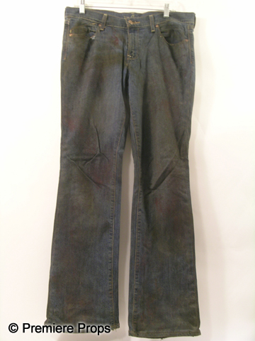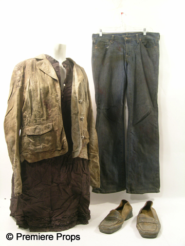 She's back...And she's bringing a few of her friends. As seen in the new installment of Resident Evil: Afterlife, this is Zombie's screen worn, hero, torn and dirty, blood, tan, long sleeve, "Reitmans" jacket (size 11) torn and dirty, bloody, Purple, " J. Crew" blouse, (size 6) torn and dirty, bloody, blue, denim "The Flirt" jeans, (size 9) and dirty, tan, leather "Aerosolest" shoes. (size 8 1/2).