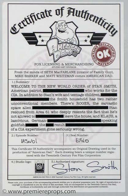 It includes a custom designed Certificate of Authenticity from "American Dad" & "20th Century Fox!" It's Authenticity is Guaranteed! This is an amazing piece of the cartoon to get a hold of!