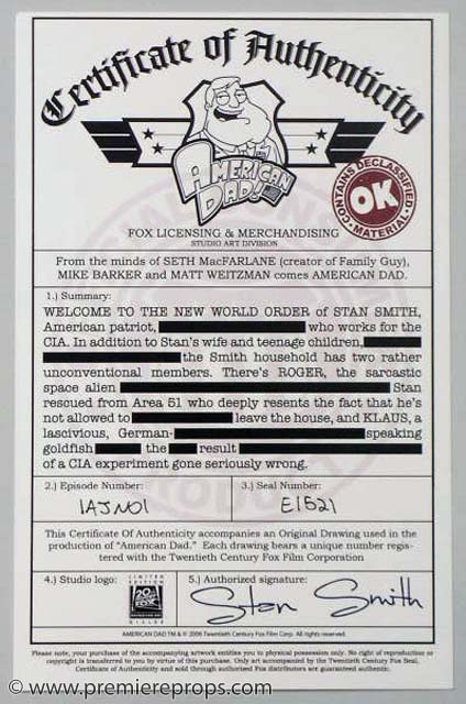 From the creator's of Family Guy comes American Dad. This is an original production hand drawing featuring Klaus. The drawing also feature a scene direction and notes handwritten on the drawing. It measures 12.5" x 10.5" and does not come matted. It does includes a custom designed Certificate of Authenticity from "American Dad" and "20th Century Fox!"