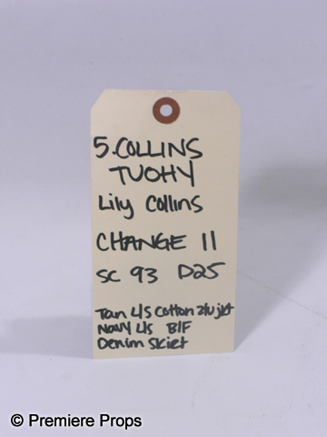 Based On The Extraordinary True StoryStraight from the set of The Blind Side, this is Collins Tuohy's (Lily Collins) screen worn khaki "rubbish" front zip jacket, (size XS) blue 'Vera Wang: Lavendar Label" silk long sleeve button down shirt with ruffle front, (Size 34) and medium wash "Theory" denim skirt with self belt. (size 00) This costume is complete with wardrobe tag!