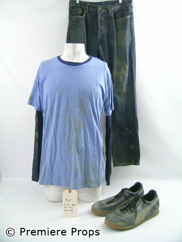 Are you ready for your heart to be broken? He's going to do it. From the set, this is Axel's (Kerr Smith) screen worn light heathered blue cotton with blue ringer "Gap" short sleeve crew neck t-shirt (*dirty) (size XL), blue denim "Gap" easy fit jeans (*dirty) (size 34), navy cotton "Old Navy" long sleeve crew neck t-shirt (*dirty) (size L), and navy leather with grey suede stripe "Puma" sneakers. (*dirty) (size 14) Includes wardrobe tag and screen worn after fall into mine!