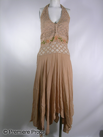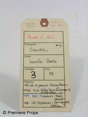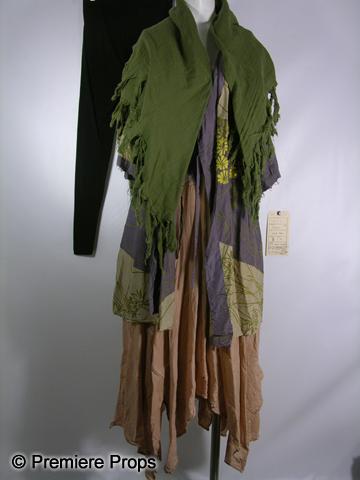 Some will kill to have it. He will kill to protect it.As seen in the new action thriller, The Book of Eli, this is Claudia's (Jennifer Beals) screen worn hero, purple with beige and green floral pattern "Eloise" robe, (Size S) salmon with floral stitch pattern halter dress, (No size) black "American Apparel" long underwear, (Size M) and green shawl with large frills. (approx 39" x 41") Includes wardrobe tag!