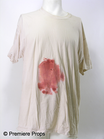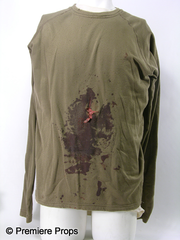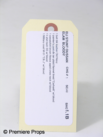 Eli's (Denzel Washington) screen worn stunt, blood stained, green hooded coat, (No size) bloody with a hole, brown "Red Head" longsleeve crewneck thermal, (Size 2XLT) bloody with a hole, cream "Hanes" t-shirt, (Size XL) blood stained brown "Carhartt" pants, (No size) and black "Old Navy" leather belt with steel buckle. (Size L) Includes wardrobe tag!