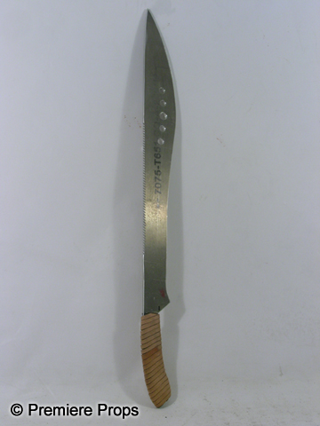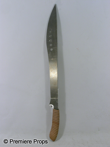 Some will kill to have it. He will kill to protect it.Straight from the set of the action adventure, The Book of Eli, this is Eli's (Denzel Washington) silver with 5 holes, metal sword with a serrated outside and smooth inside. The handle is tied light brown rubber robe with foam padding for cushion. There are numbers on one side of the swords blade. This was possibly a prototype or used for training. (approx. 30" long.)