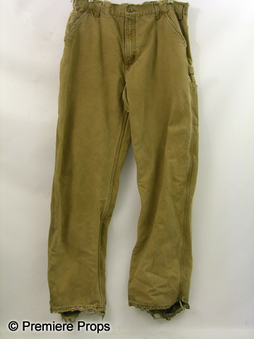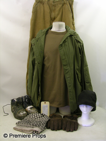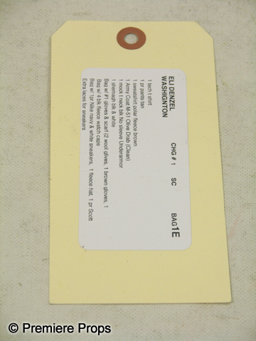 Some will kill to have it. He will kill to protect it.Direct from the set of The Book of Eli, this is Eli's (Denzel Washington) screen worn white short sleeve crew neck "Hanes" t-shirt, (size XL) brown long sleeve crew neck "Red Head" sweatshirt, (Size 2XLT) olive drab long sleeve button and zip up with pockets in front and hood army coat, (no tags) khaki five pocket "Carhartt" pants, (size 36x34) black pull over hat, brown insulated with velcro straps gloves, black and white scarff, and black and white lace up "Nike" shoes. (size 11.5) Includes wardrobe tag! Everything is very dirty, worn, and are shoes taped together.