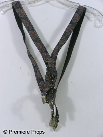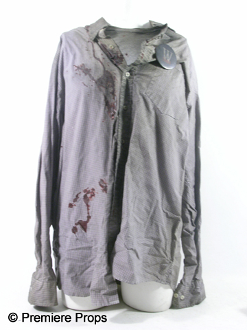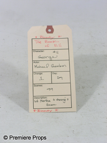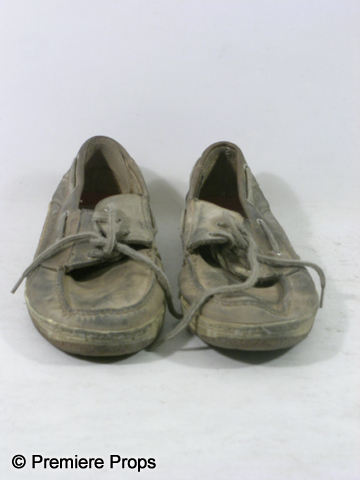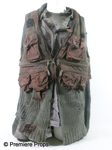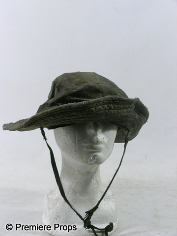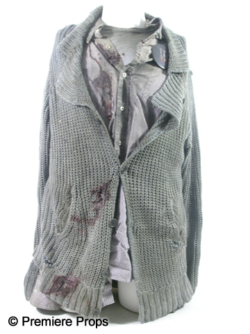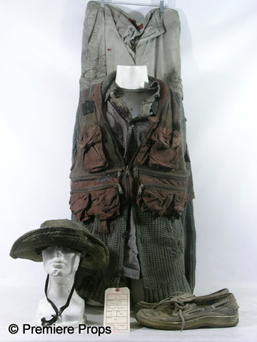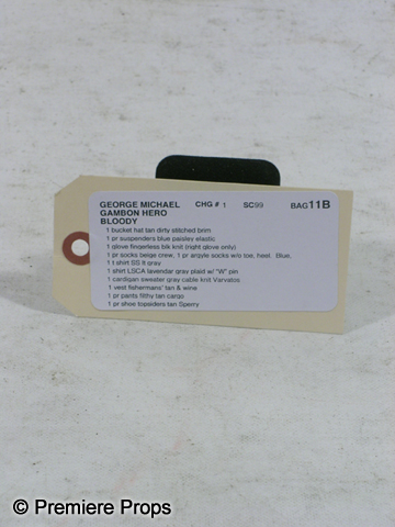 George's (Michael Gambon) screen worn Hero, bloody and dirty, tan and wine fisherman's vest with holes, tattered gray cable knit "John Vavatos" cardigan sweater (size XL), tattered lavender gray plaid"Eddie Bauer" long sleeve shirt with a "W 2004" pin (size XXL "George" on the back neck), tattered gray short sleeve "Gap" t-shirt, (size XL) filthy tan "626 Blue" cargo pants, dirty tan with a stitched brim bucket hat, blue paisley elastic suspenders, one fingerless black knit glove, and a pair of tan "Sperry" topsider shoes. (size 14m) Includes two wardrobe tag!