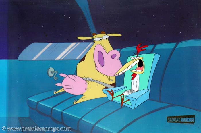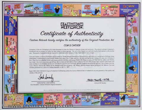 This is an original production cel featuring Cow and Chicken in the backseat of the car. It measures 12.5" x 10.5" and does not come matted. This beautiful cel includes a Certificate of Authenticity from "Cartoon Network!"