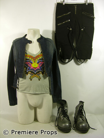 He was dead...But he got betterAs seen in the action packed thriller, this is Venus' (Efren Ramirez) blue denim "DKNY" cropped jacket (size M), gray with Mardi Gras style mask graphic on front "Spark in the Dark" v-neck shirt (size M), black "Lip Service" 3/4 length pants with zipper pockets and suspenders (size 29), and silver "Smack" boots. (approx. size 10)