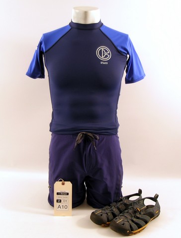 WINTER's amazing true story... now has HOPE. Direct from the set of Dolphin Tale 2, this is Sawyer Nelson (Nathan Gamble) screen worn, hero, royal blue with light blue sleeves Staff Aqauarium logo on the front 'Ocean Tec' rashguard, navy tie in the front 'LL Bean' board shorts, (size 30) and blue grey 'Keenes' water shoes. (size 10.5) Includes wardrobe tag!