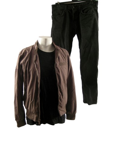 This house looked like an easy target. Until they found what was inside. Straight from the set of Don't Breathe, this is Alex (Dylan Minnette) screen worn, distressed from production, blood at the neck, brown zipper up the front with front pockets 'Members Only' jacket, (size S) black short sleeve with front pocket 'Levis' t-shirt, and black denim 'H&M' jeans. (size 32/34)