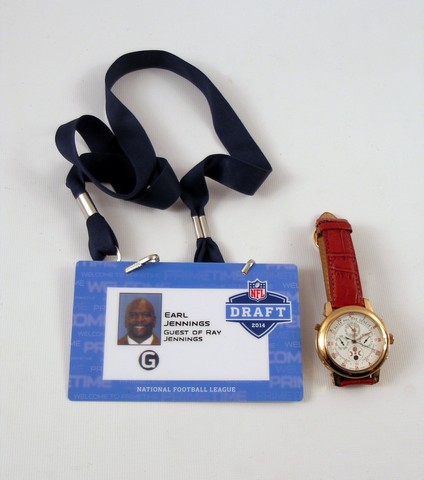 The greatest victories don't always happen on the field. From the set of Draft Day, this is Earl Jennings (Terry Crews) screen worn, hero, 2014 Draft ID card lanyard, and faux 'Patek Philippe Geneve' wrist watch.