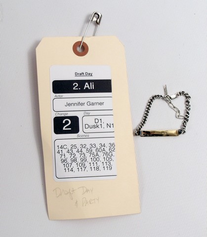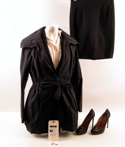 The greatest victories don't always happen on the field. From the set of Draft Day, this is Ali (Jennifer Garner) screen worn, hero, navy zipper front with self belt, tan lining 'Elizabeth Roberts' overcoat, (size L) black button on the front 'Burberry' suit jacket and skirt, (size 6) pale pink sleeveless 'Luciano Barbera' blouse, 14k gold thin necklace with small stones on the front, ID bar bracelet, and black leather 'Alaina' heels. (size 39 1/2, 4" heel) Includes wardrobe tag!