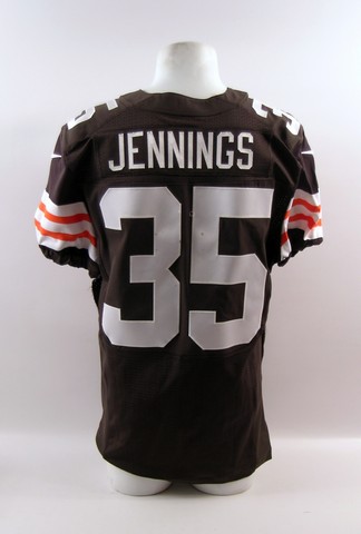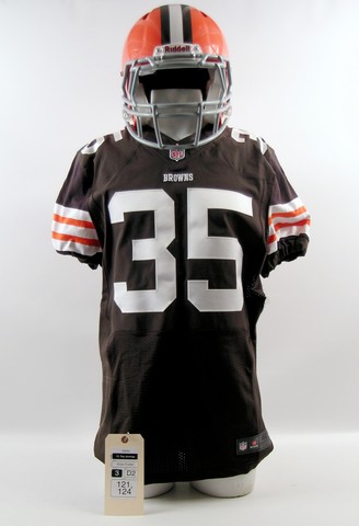The greatest victories don't always happen on the field. From the set of Draft Day, this is Ray Jennings (Arian Foster) screen worn, hero, Cleveland Browns number 35 NFL football jersey with his name on the back, (size 48) and Cleveland Browns NFL football helmet. Includes wardrobe tag!