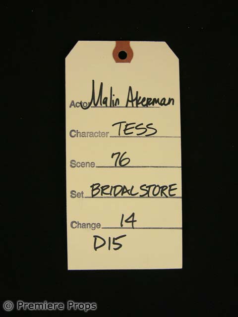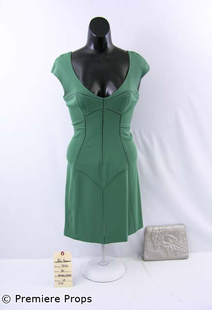 Direct from the set of 27 DRESSES, this is Tess' (Malin Akerman) screenworn costume that includes a green "Dolce & Gabbana" cap-sleeve dress, and a cream-colored leather alligator "Nancy Gonzalez" clutch purse with opal sheen and embossed flowers on the front (purse measures approximately 9x7"). Wardrobe tag is included!
