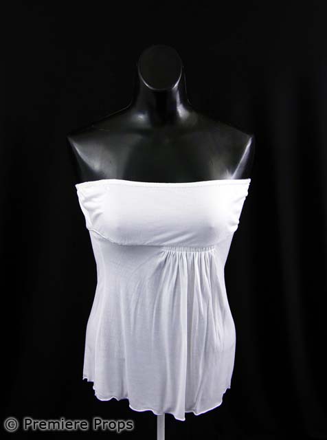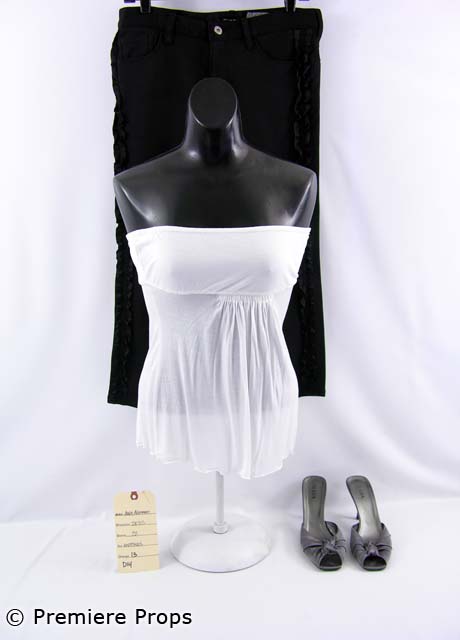 27 Dresses, this is Tess' (Malin Akerman) screenworn hero costume. This chic outfit consists of a white "Miu Miu" tube top, black "Junya Watanabe" pants with side ruffles and pewter silk "Prada" open toe shoes. Includes original wardrobe tag!