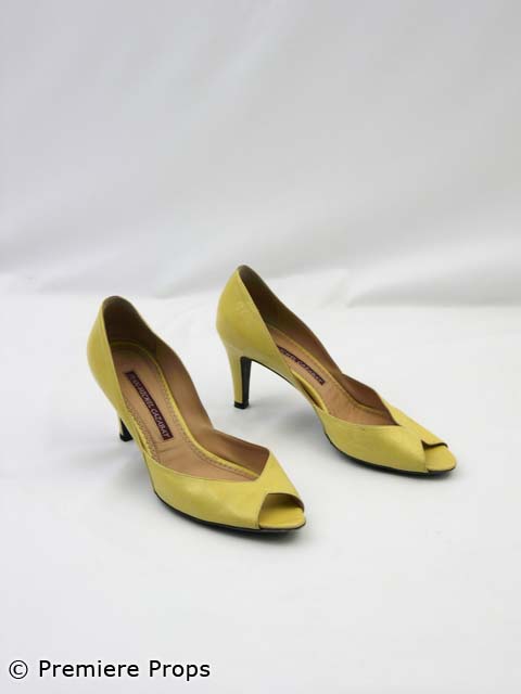 27 Dresses, this is Tess' screenworn hero costume. This ensemble features a dark denim "Dolce and Gabbana" halter minidress with a back tie, 2 front pockets and leopard lining, a metallic mint green "Nancy Gonzalez" clutch with embossed flowers on the front and yellow leather "Jean-Michel Cazabat" peeptoe pumps. Includes the original wardrobe tag!