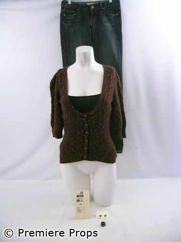 He's leaving virgin territory Direct rom the set of Sex Drive, this is Felicia (Amanda Crew) screen worn brown cotton/poly with multicolor flecks "Kimchi & Blue" 3/4 sleeve button up cardigan (size S), dark blue denim "Paige" jeans (size 28), black cotton/spandex "Forever 21" spaghetti strap tank top (size S), green and brown leopard print "Betsey Johnson" heart shaped stud earrings, and black with silver stars ring. Includes wardrobe tag!