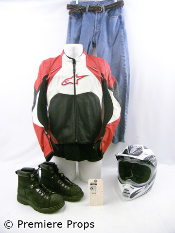 He's leaving virgin territory From the set of the hilarious film, Sex Drive, this is Rex's (James Marsden) red, white, and black "Alpine Stars" long sleeve zip up motorcycle jacket (size 40), light blue denim "Levi's" jeans (size 31 x 32), brown braided leather with gold buckle belt (size 38-40), black cotton with multi-color warrior print "Otomix" sleeveless shirt (size M), white, grey, and black "Pilot" motorcycle helmet, and black suede "Caterpillar" work boots. (size 10) Includes wardrobe tag!