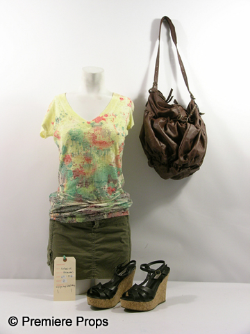 The rumour-filled totally FALSE account of how I ruined my flawless reputationAs seen in the new high school comedy, Easy A, this is Rhiannon (Alyson Michalka) screen worn, hero, yellow cotton v-neck, green, red, and grey graphic Charolette Russe' t-shirt, (size S) olive green mini-cargo style with peace symbol 'Guess' skirt, (size 26) brown leather 'Amici' purse, and dark brown slingback with cork wedge 'Steve Madden' shoes. (size 8.5) Includes wardrobe tag!