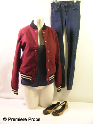 Featuring Miley Cyrus & Demi Moore Straight from the set of LOL, this is Emily (Ashley Hinshaw) screen worn, maroon and black Lettermans jacket, dark purple 'American Apparel' tank top, (size XS) dark blue stretchy 'Seven for all Mankind' leggings, (size 25) and cream and black 'J. Crew' flats. (size 6 1/2)