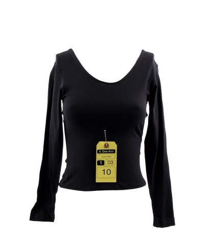 A true story about art and the art of deception.From the set of Big Eyes, this is DeeAnn (Krysten Ritter) screen worn, hero, black long sleeve scoop neck 'Danskin' top. (size M) Includes wardrobe tag!