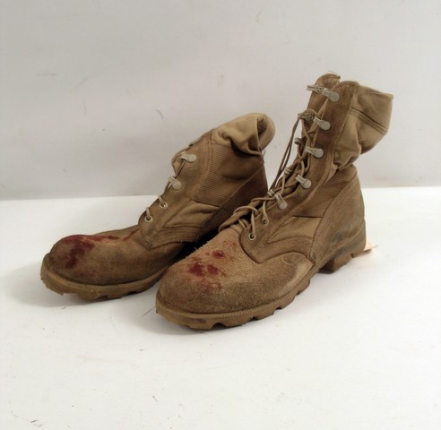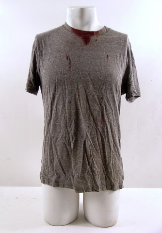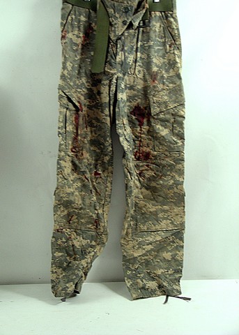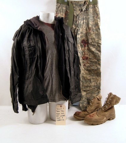 Sometimes your battles choose you. Direct from the set of the new hit film, Out of the Furnace, this is Russell Baze (Christian Bale) double's, worn from production and bloody, black polished cotton two breast patch pockets zipper up the front 'Heliz' jacket, black fleece lined with grey thermal zipper up the front hooded sweatshirt, medium grey heathered 'BDG' short sleeve t-shirt, (size M) green nylon belt, digital camo military cargo pants, and tan rough out and canvas lace up the front 'CRC' boots. Includes wardrobe tag!