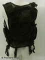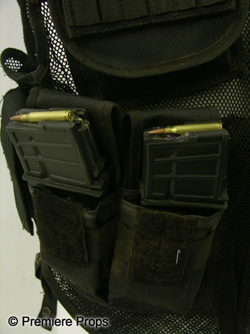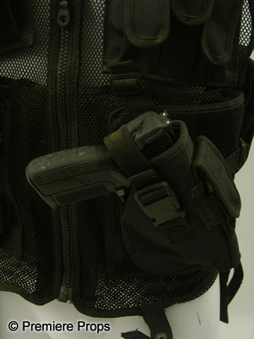 In the near future, you don't live to play... you'll play to live.As seen in the Sci-Fi action thriller, Gamer, this is Kable's (Gerard Butler) screen worn, bloody, torn at the shoulder, black nylon and mesh zip up vest with snaps!!! This incredible vest has black foam rubber and brass metal dummy rifle clips and a black foam rubber pistol with extreme detail! This is the only complete vest screen worn by Gerard Butler available! This an extremely rare opportunity to own an incredible vest screen worn by one of Hollywood's hottest stars!