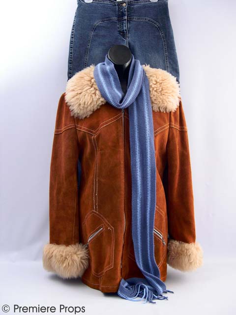 The face behind the mask. This is the original outfit worn on screen by Judith Myers (Hanna Hall) during the production of HALLOWEEN. Items include: A rust colored foe fur suede jacket (size 13). A pair of blue denim "Bebe" jeans (no size indicated). And a blue / light blue striped scarf.