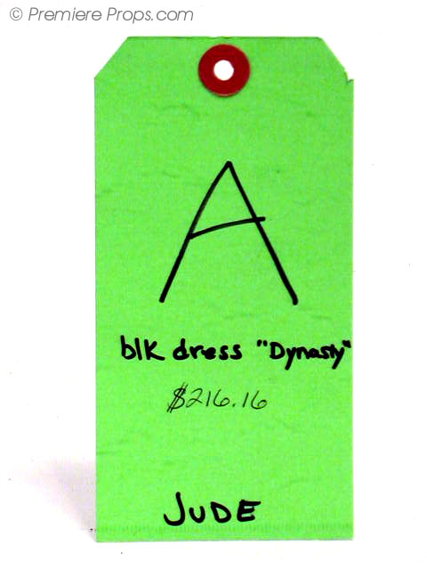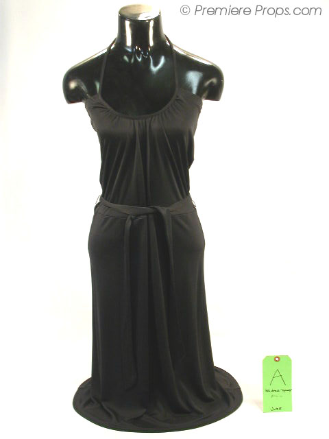 A "Dynasty International" black evening dress worn by Jude (MAGGIE GYLLENHAAL) in the film "Happy Endings". Features strings that tie around neck and a waist sash. Size M. Includes costume department wardrobe tag. Own this amazing screenworn costume!