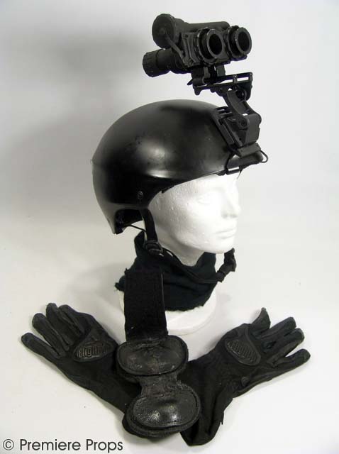 This complete outfit includes a FBI SWAT vest, dark blue uniform shirt, dark blue cargo pants, shin pads, single elbow pad, gun holster and belt, SWAT helmet with scope, pair of Flight X gloves and a head scarf.Shirt, pants and vest are all severely burnt. There is no size indicated on the vest which features a FBI button on patch on the front and back. The shirt is a size 42 and the pants are a 32 and include a belt with a slide adjustment. Shin and Elbow pad are plastic and foam with velcro straps and are heavily burned and melted. Black tape was wrapped around some of the straps that are burnt. The gun holster and belt show some minor wear and fraying. SWAT helmet with scope is actually a modified snowboard helmet which has a clip for attaching a night vision scope. The scope is heavily worn metal that does not function. Flight gloves are made from heavily worn kevlar with leather pads and do not indicate a size. The headscarf extends to the chin and is made from an unknown synthetic fabric and shows heavy wear and fraying.