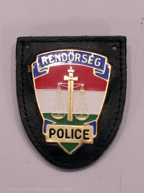 This Hungarian police belt badge was used in the film "Underworld: Evolution." It measures 3" x 2.5". The metal badge is on black leather. There is a metal clip on back to attach to a belt. This prop was used on screen! Own this awesome movie prop today! Authenticity is Guaranteed!