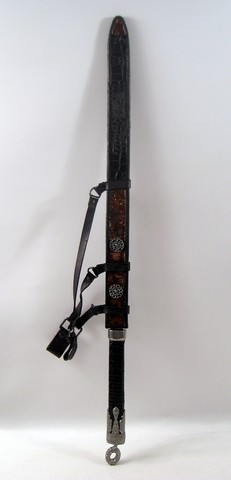 Straight from the set of Last Knights, this is Raiden (Clive Owen) screen used, hero, metal with engraved blade leather handle with plastic design at the end sword with leather snakeskin design sheath. (approx. 40 1/2" long)