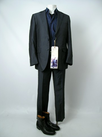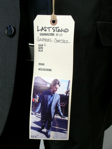 Retirement Is for Sissies. Straight from the set of The Last Stand, this is Gabriel Cortez (Eduardo Noriega) HERO screen worn 2 piece suit with matching shimmering black steel jacket and pants "Abito Sartoriale"; black short sleeve tactical shirt with foam sewn in holsters "5.11 Tactical Series" (size M), a deep iridescent midnight blue long sleeve button front dress shirt with vertical black lines "Enzo" (size 16 34/35), black leather belt with solid dark silver/grey buckle "Murano" (size 36), and fine black leather ankle boots "Magnanni" (size 10.5 ). Also with black Gianni wardrobe bag, screen used. Wardrobe tag included.