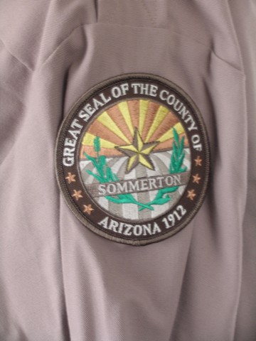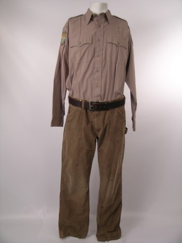 Retirement Is for Sissies. Straight from the set of The Last Stand, this is Ray Owens (Arnold Schwarzenegger) screen worn, hero, dark brown leather 'Tony Nowak' bomber jacket, khaki with 'Sommerton Arizona' patches on the sleeves "Flying Cross" sheriff shirt, white 'Banana Republic' undershirt, taupe canvas 'Ralph Lauren' work pants, and brown leather belt.