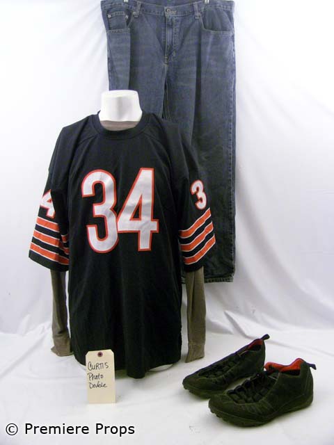 The New Coach Has A Secret Weapon. Direct from the set of the true story about Jasmine Plummer, the first female to play in a Pop Warner football tournament in its 56-year history. This is Curtis' (Ice Cube) photo double hero navy with white and orange trim, number "34" center front and "Payton 34" center back, "Mitchell and Ness" short sleeve crew neck football jersey (size L), medium blue denim "Merona" jeans (size 38 x 30), mushroom brown thermal "Cherokee" long sleeve crew neck t-shirt (size XL), black perforated suede with black stripes "Adidas" sneakers (size 13), and black straw "Golden Gate Hat Co." porkpie hat. Includes wardrobe tag!