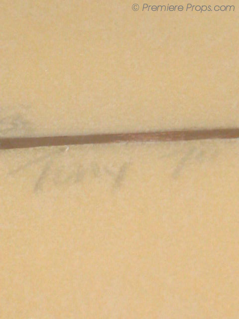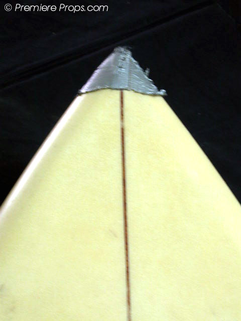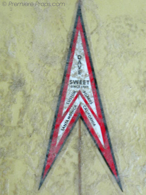 Dave Sweet Custom Natural Color Surfboard (83" x 19.5"). The top of the board has been waxed and shows minor dings and scratches from use during production. There is duct tape repair on the nose, tail and the side of the board.