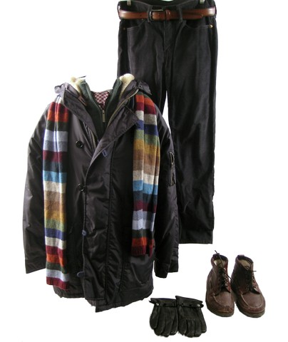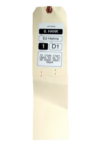 You Can't Regift Family . Straight from the set of Love the Coopers, this is Hank (Ed Helms) screen worn, hero, navy blue nylon with cream fleece lining with hood, zipper, and buttons 'J. Crew' parka jacket, (size M) multi color wool vertical stripe scarf, dusty hunter green 'Geoffrey Beane half zip sweater, (size M) grey white fine pin dot long sleeve button down 'Sonoma' shirt, (size S) white short sleeve v-neck 'Hanes' t-shirt, (size S) maroon, silver, and grey plaid 'Bar III' neck tie, black leather gloves, camel brown slightly textured 'Perry Ellis' belt, (size 34/35) deep sage corduroy 'Levis' pants, (size 32 x 30) and chocolate brown leather lace up the front with fleece lining 'LL Bean' shoes. (size 9.5) Includes wardrobe tag.