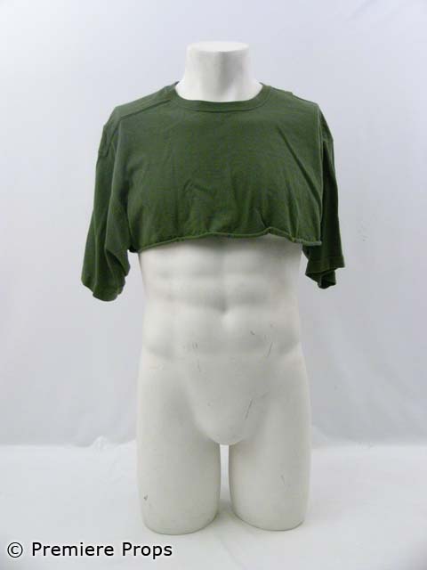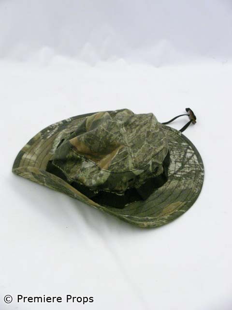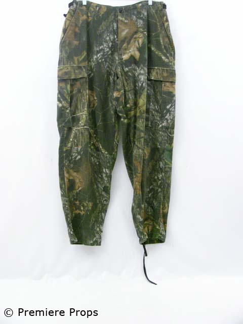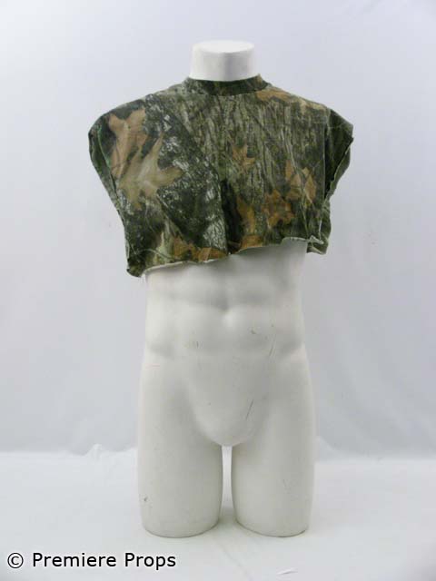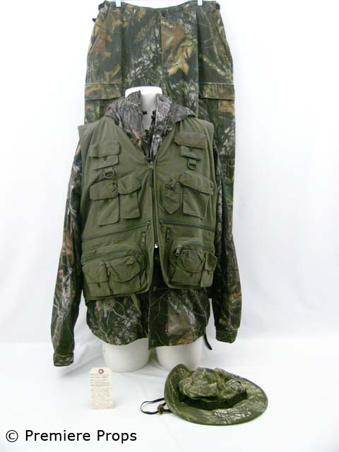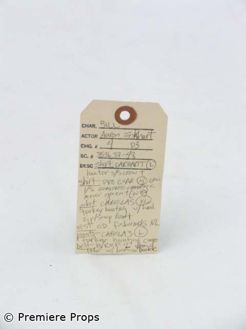 this is Bill's (Aaron Eckhart) screenworn forest camouflage "Cabelas" zip/snap front hooded turkey hunting jacket with an olive fishing vest taped on, and forest camouflage "Cabela's" turkey hunting cargo pants, olive green "carhartt" short sleeved crew neck t-shirt (*cut off at midriff), as well as a forest camouflage "Jerzees Outdoors" short sleeved crew neck t-shirt (*cut at midriff), and a forest camouflage "Cabela's" fishing style hat. Includes wardrobe tag!