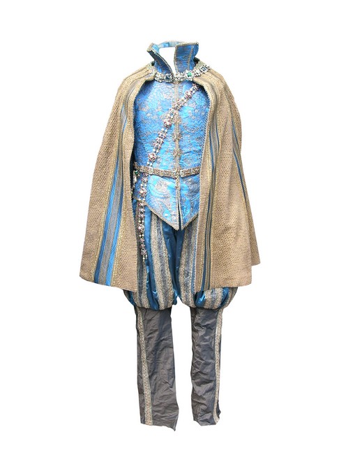Every legend has a new beginning. Direct from the set of Three Musketeers, this is Duke of Buckingham (Orlando Bloom) screen worn, hero, custom made dark gold and teal with sparkle lace design and clips at the neck with long necklace cloak, teal with gold sparkle lace design, clips up the front with self belt jacket, teal with gold lace black at the bottom trousers, chest piece belt, and gold gloves. This is a very key costume worn during the filming of Three Musketeers!