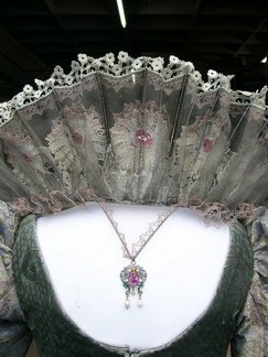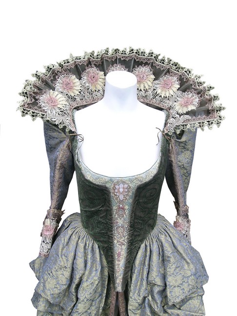 Every legend has a new beginning. Direct from the set of Three Musketeers, this is Milady De Winter (Milla Jovovich) screen worn, hero, custom made gold, and purple floral with lace all over, tie in the back with clips, and bustier style top, long dress, and lace with floral lace neck piece. These dresses are one of a kind and are completely custom!