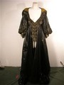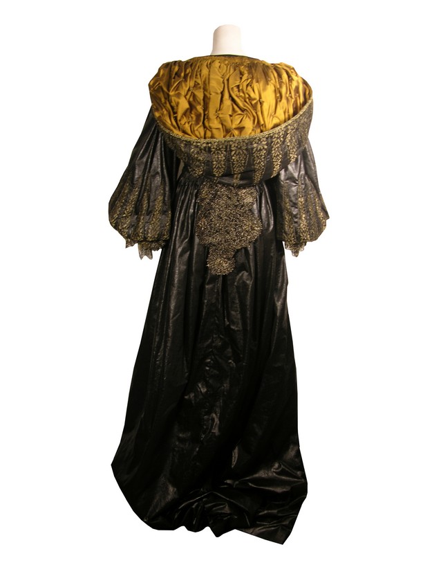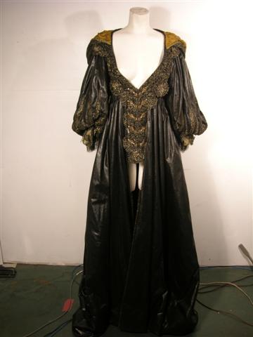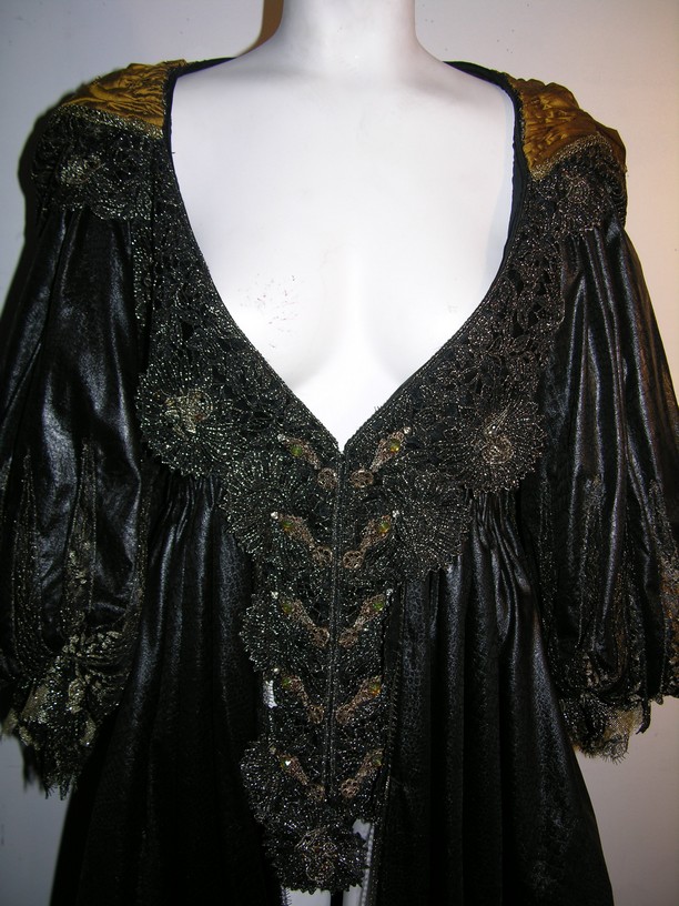 Every legend has a new beginning. Direct from the set of Three Musketeers, this is Milady De Winter Hero, screen worn, ornate black with gold trim on bodice and sleeves and jewels below cleavage, long dress, dark gold ruffled at the chest lace up the back with snaps long custom made dress, and black with gold lacing gloves. From the Venetian Safehouse.