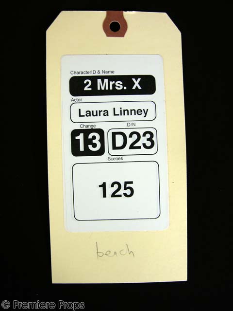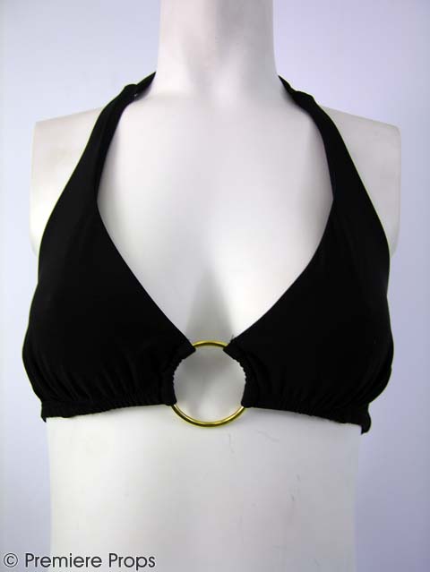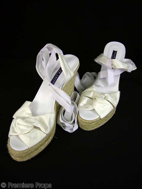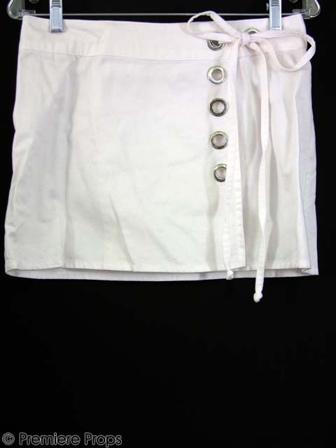A comedy about life at the top, as seen from the bottom. This is Mrs. X's screenworn black "Lisa Currin" bikini top with a gold ring, cotton blue, fuschia, green, and black "Pucci" blouse. A white "Dolce & Gabbana" wrap miniskirt with silver rings. Also, a pair of white "Ralph Lauren" wedge sandals with long ankle ties. Included with this costume is the original wardrobe department tag.