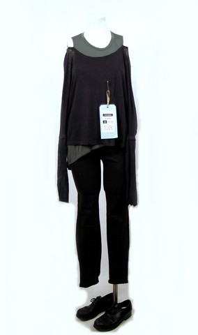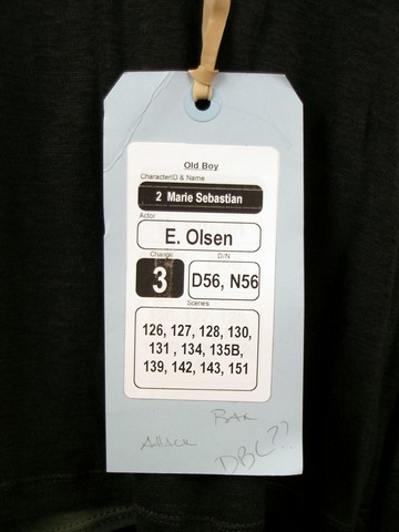 Ask not why you were imprisoned. Ask why you were set free. Straight from the set of the new mystery thriller, Oldboy, this is Marie (Elizabeth Olsen) screen worn, hero, dark charcoal to black gauzy knit over-sized body attached long sleeve shirt with olive green t-shirt, brown skinny 'J. Brand' pants, and black leather lace up the front Oxford style shoes. Includes wardrobe tag!
