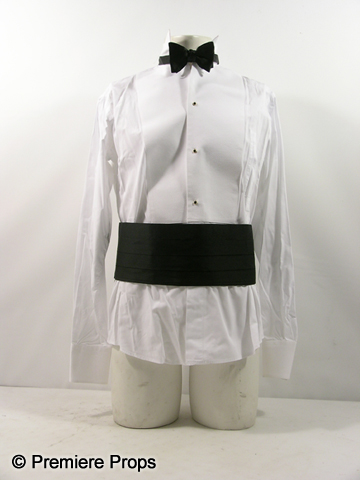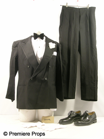 Once upon a time in Nazi occupied France...Straight from the set of Quentin Tarantino's critically acclaimed masterpiece, Inglourious Basterds, this is Pfc. Omar Ulmer (Omar Doom) screen worn, hero, black single breasted tuxedo jacket with white pin on flower, white pocket square, white long sleeve with detachable wing collar and gold colored with black stone shirt studs, 'La Valiere' tuxedo shirt, (size XL) black clip in the back cummerbund, white cotton gloves, black with shiny black stripe down the side 'Aaw-berlin' tuxedo pants, and shiny black leather lace up the front 'Siam Costumes' dress shoes. (size 8) Includes wardrobe tag!