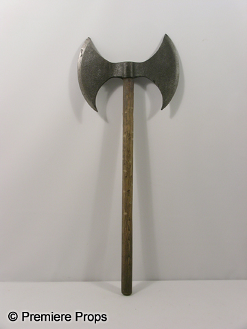 It destroyed his world. He won't let it destroy ours.From the set, this is a dirty and worn, black hard rubber double sided blade with wood handle, battle axe. (approx. 29" long)