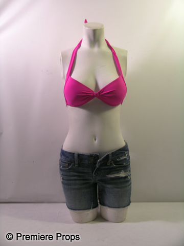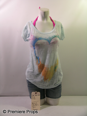 Double the action. Double the terror. Double the D's Direct from the set of Piranha 3DD, this is Shelby (Katrina Bowden) screen worn, hero, light blue burnout with heart design on the front 'American Eagle' t-shirt, (size S) pink 'Sunsets' bikini top, (size S) and medium blue cut off 'American Eagle' shorts. Includes wardrobe tag!