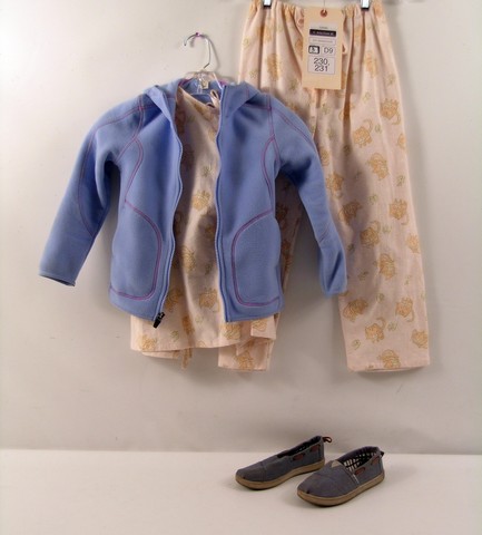 A hidden truth. A desperate search. Straight from the set of Prisoners, this is Anna Dover (Erin Gerasimovich) screen worn, hero, blue long sleeve zipper front 'Lands End' sweater, (size 8) two piece tie in the back animal print hospital PJ's, and blue with leather topsider design 'Tom's' shoes. Includes wardrobe tag!