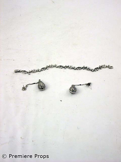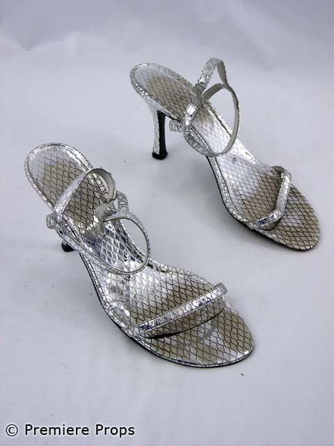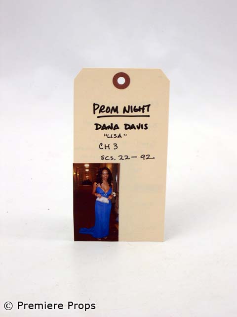 Prom Night, this is Lisa's (Dana Davis) screenworn hero costume. This costume features a royal blue with an oval white rhinestone broach on front with built-in bra top and long train gown, silver with snakeskin pattern "Stuart Weitzman" strappy high heeled sandals, a silver satin beaded "Nordstroms" clutch, a silver scroll bracelet and long silver teardrop earrings. Photo of the wardrobe tag is available. No wardrobe tag included with the costume.