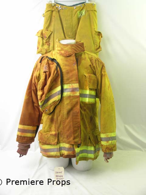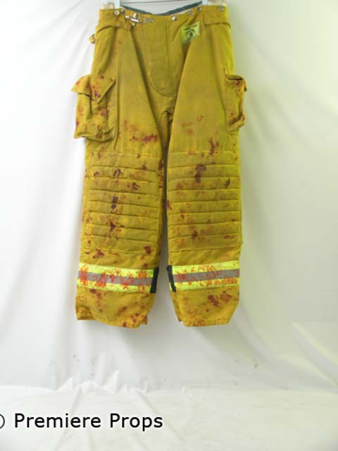 No details. No witnesses. No evidence. Until now. Direct from the confined set of Quarantine, this is Jake's (Jay Hernandez) Double's yellow with neon yellow and white reflective stripes, neon yellow "Morning Pride" patch on right breast, long sleeve velcro, zip up bloody fireman's jacket, and yellow with neon yellow and white reflective stripes, padded knees with "Morning Pride" patch near top fireman's pants. The entire costume is bloody and was screen worn by a Double. Includes wardrobe tag!